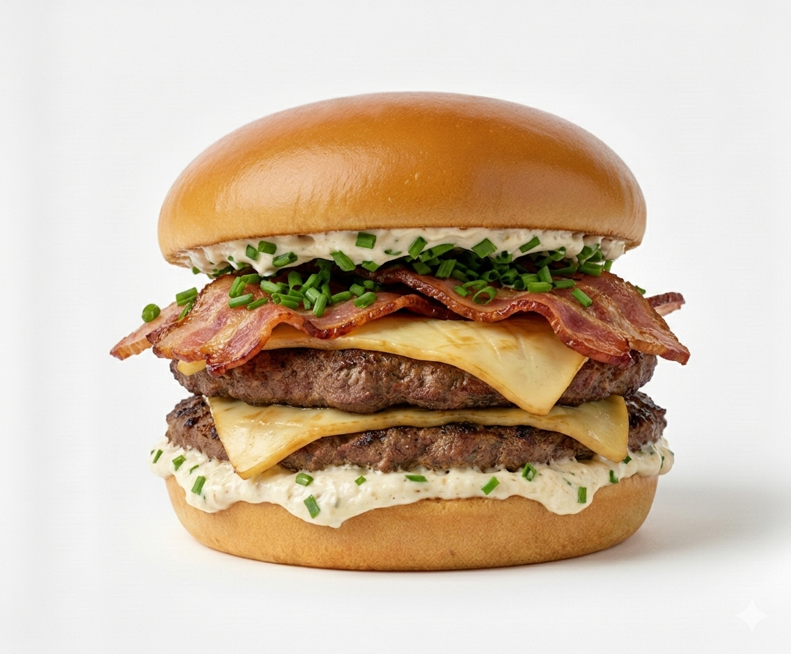 250g/ maslová žemľa, pikantná salsa,majonéza, čerstvá cibuľa, jalapenos papričky, 2x cheddar syr, slanina, hovädzie mäso 150g